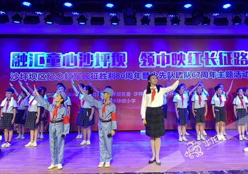 11日下午,为纪念红军长征胜利80周年,在第67个中国少年先锋队建队日前夕,沙坪坝区在融汇沙坪坝小学举行了相关主题活动。通过诗歌朗诵、新队员入队仪式等活动,牢记红军长征精神,沙坪坝全区大队辅导员和融汇沙坪坝小学的一年级全体师生近500余人参与了本次活动。
