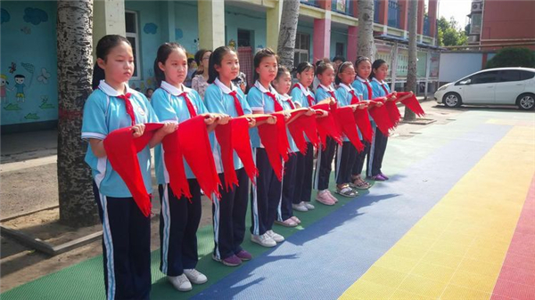 此时此刻,新队员们心潮澎湃,在鲜艳的队旗下,举起右拳,在大队长的领誓下庄严宣誓:“我是中国少年先锋队队员,我在队旗下宣誓:我热爱中国共产党,热爱祖国,热爱人民,好好学习,好好锻炼,准备着,为共产主义事业贡献力量!”