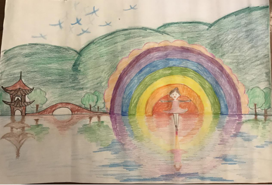 图为小队长杨王玥在西湖边为西湖创作的美术作品