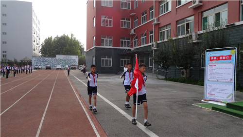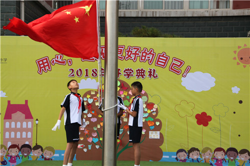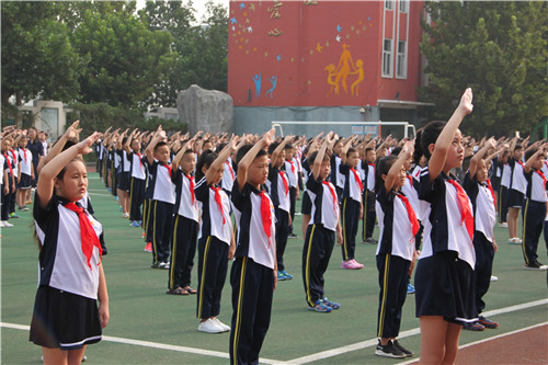 在老师的带领下,各级部的孩子们排成整齐的队列,走进操场,相聚在国旗下。小小国旗手们身着统一的校服,整装待发,即将升起寓示着新学期新起点的国旗。