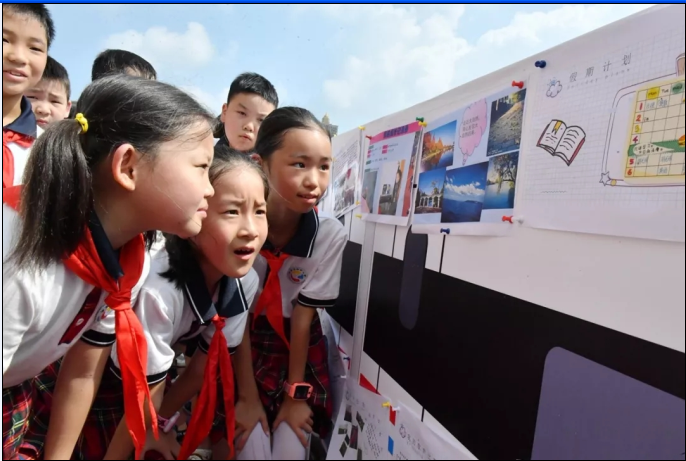 随着国歌响起,五星红旗随风飘扬,开学典礼拉开帷幕,典礼上,一辆特别打造的“红领巾创未来——我做新时代好少年”和乐号列车缓缓驶来,专列上展览着同学们的特色暑假作业,有图文并茂的暑假周记,有色彩斑斓的书法绘画,还有造型独特的手工作品……每一份饱含学生创新能力的特色作业都洋溢着童真、童心、童趣,吸引了一个个驻足观看的同学,啧啧称赞声接连不断。