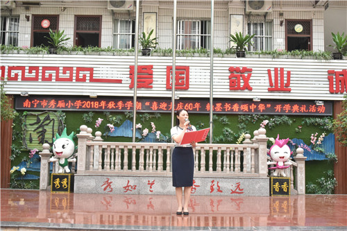 “中华崛起迎盛世,封疆六十喜空前。”在举国同庆改革开放40周年,美丽壮乡喜迎广西壮族自治区成立60周年之际,开学了!9月3日,南宁市秀厢小学1300多名师生和200多名一年级新生家长欢聚一堂,举行2018年秋季学期“喜迎大庆60年 翰墨书香颂中华”主题开学典礼。
