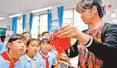 日前,重庆九龙坡区铁路小学五年级(1)班的学生在接受课后服务时,学习市级非遗项目——九龙坡剪纸。