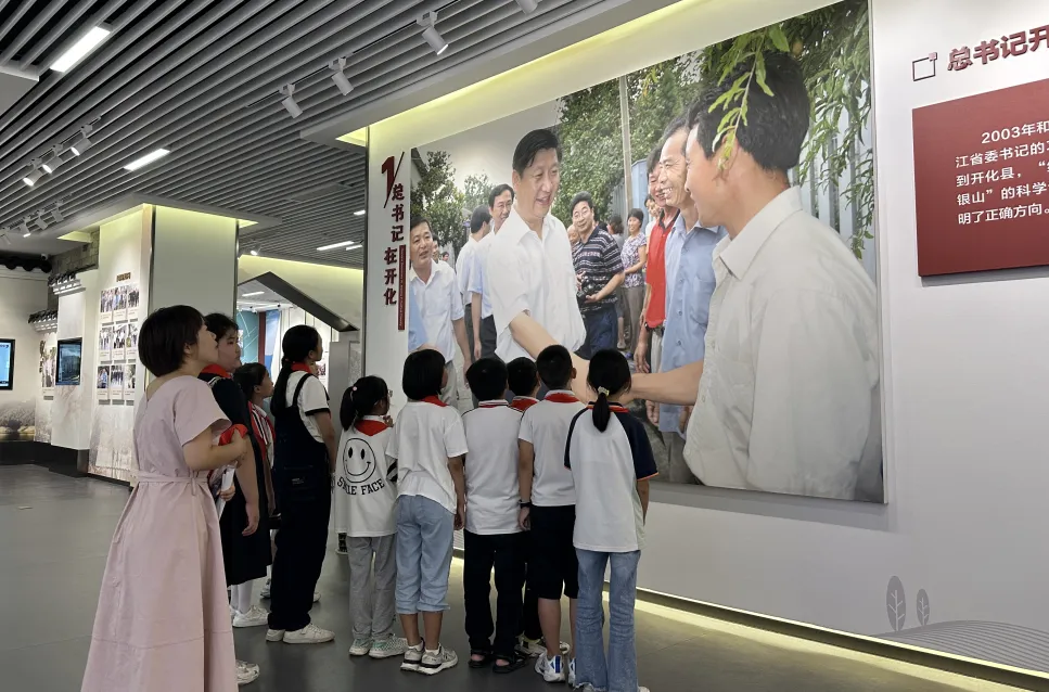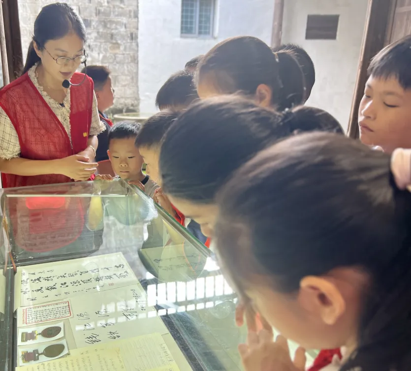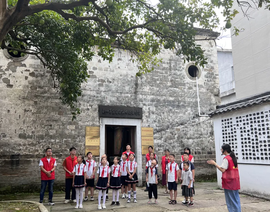 社区8090宣讲员带着少先队员们进入新四军集结组边旧址陈列馆一起追忆抗战历史。在陈列馆内,队员们通过聆听陈毅将军在华埠的故事、观看新四军一二三支队集结组编纪录片、“触摸”抗日战士物品,感受历史脉搏,汲取奋进力量。