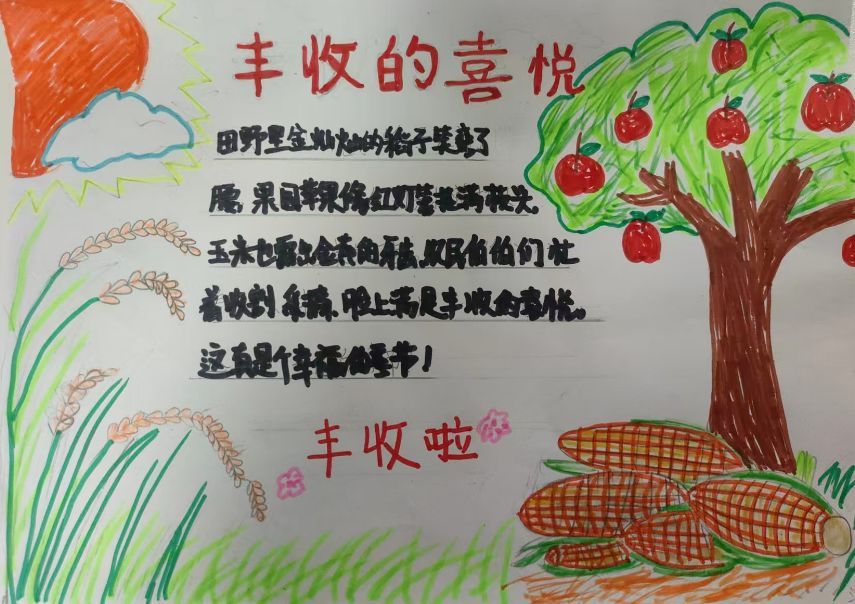 队员们绘制了精美的“丰收节“”绘画、手抄报,还有的队员做了种子贴画,展现了祖国丰收的美好景象,用自己喜欢的方式,欢度“丰收节”。