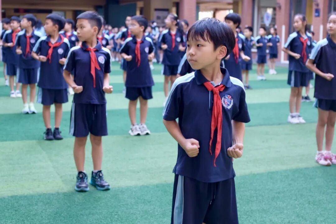 操场上,一声声“嘿!哈!”的清叱划破长空,武术操比赛拉开战幕。小选手们抱拳站立,推掌生风,马步稳扎,一招一式虽显稚嫩,却已初具形神。阳光映照着一张张沁出汗珠的稚嫩脸庞,也映照着他们眼中闪烁的坚毅光芒。鲜艳的红领巾随动作飞扬,中华武术的魂,正随着刚劲的动作,深深植根于少年心间。
