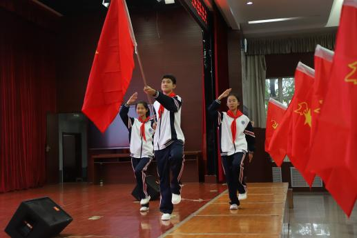 伴随着庄严的出旗曲,队旗在旗手和护旗手的护送下缓缓入场。全体少先队员敬队礼。