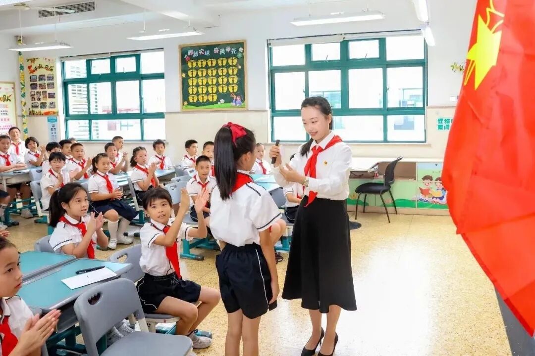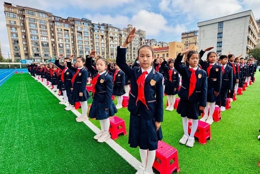 仪式上,新队员名单正式公布,老队员及各位领导嘉宾为新队员佩戴红领巾,鲜艳的红领巾在孩子们胸前飘扬,标志着他们正式加入少先队这个光荣的集体。新队员们高举右拳,庄严宣誓,誓言铿锵有力,回荡在校园上空。