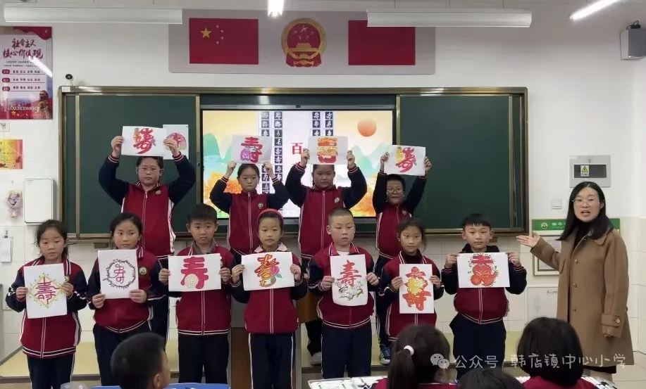 美术课的画纸上,更是藏满了对长辈的祝福。少先队员们握着彩笔,或工整写下不同字体的“寿”字,或在字旁添上挺拔的青松、饱满的仙桃、翩跹的仙鹤。一笔一画都格外认真,仿佛要把所有的美好祝愿,都融进这张“百寿图”里。