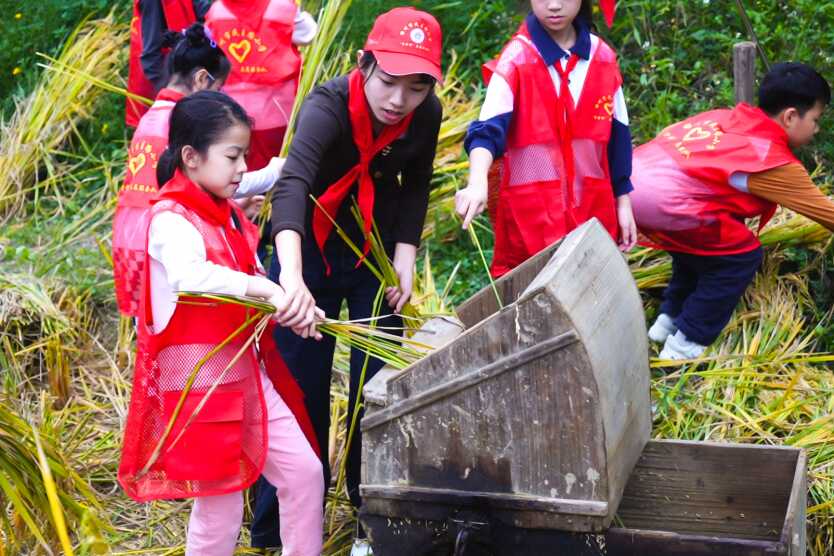 收稻结束后,热闹的打谷环节拉开序幕。队员们小心翼翼地将稻穗对准打谷机滚筒,“嗡嗡”的机械声里,金黄的谷粒簌簌落入接谷筐。“快来看!我们的谷筐满啦!”当看到颗粒饱满的稻谷堆积起来时,队员们围着筐子欢呼,眼中满是自豪,劳动的成就感在心中悄然升腾。