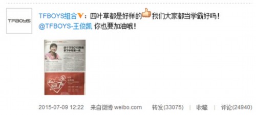 赵雨晴玩手机的一大主题,是关注人气少年偶像组合TFBOYS,关注偶像王俊凯。上初三时,她喜欢上了这个组合。她的目标就是“一定要比王俊凯好,同样是学生,他怎么会这么优秀,还这么小就站在这么大的舞台上。”中考结束后,她缠着妈妈去了王俊凯的家乡重庆,还特意去了王俊凯录制MV的洋人街等地。