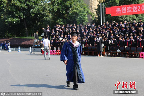 七月如火,但在武汉体育学院网球场上,还活跃着一位84岁高龄助教的身影。他叫张仁鹏,在该院蹭课10年了。在今年6月30日学校举办的毕业典礼上,白发苍苍的他身着硕士服,接受了老师和同学的毕业祝福。“没有老师和同学的细心照顾,这10年我坚持不下来。”虽然没有毕业证、学位证,但张仁鹏谈起自己的求学生涯仍满怀感激。