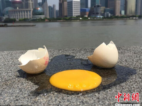 上海外滩观光平台的石块护栏上,打开一个鸡蛋,约一刻钟已被煎成六分熟。
