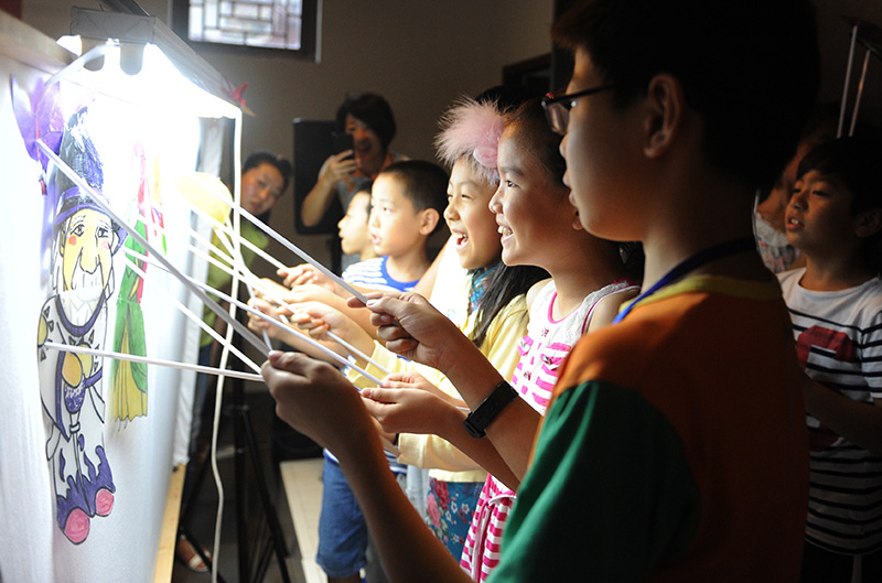 8月18日,北京市东城区朝阳门街道社区的青少年学习皮影表演技巧。在专业老师的指导下,孩子们自己动手制作皮影道具,并发挥自己的创造力和想象力自编自演身边故事。为弘扬中华民族的传统美德,传承中华民族的传统文化,该地区在暑假期间组织6至18岁的青少年参加传统文化体验活动,学习相声、快板、昆曲、皮影戏等课程。