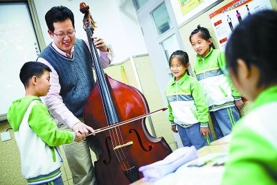 “那你们想听什么曲子?”这次为他们讲课的是来自北京交响乐团的低音提琴演奏家宋晓亮。他话音刚落,就听“喜羊羊与灰太狼”“熊出没”“大头儿子小头爸爸”的叫声在小小的教室里此起彼伏。当宋晓亮操起琴弓,这个庞大物件儿传出了孩子们熟悉的“喜羊羊”旋律时,教室里的呼喊声瞬间停止,一个个小脑袋都跟着音乐摇晃起来。