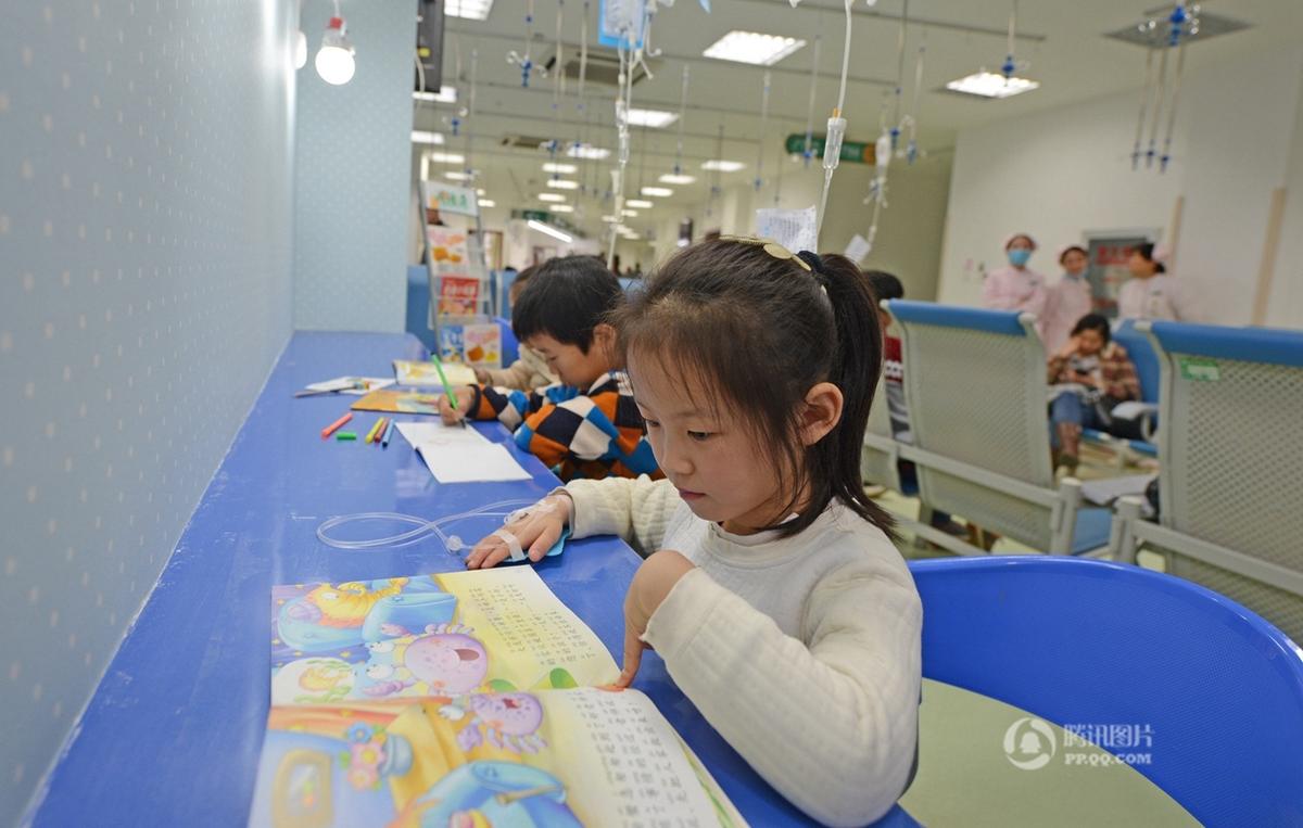 湖北武汉某医院儿科门诊,开设儿科输液室书香一角,方便学生打针时兼顾学习,堪称医院里的“吊瓶班” 。
