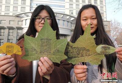熟悉的大学校园,你会以哪种方式铭记校园时光?近日,河南农业大学三名大一学子以校园中采集的落叶为画布,用签字笔在树叶上绘制校园里的建筑、风景,以这种最朴实的感情纪念在大学里即将度过的第一学期。要画好一片树叶画,需要先将落叶夹在课本中风干,然后比照着照片一点点画上线条,大学生李攀说,这样细致的绘画过程能让她静心感受到母校悠久的历史。
