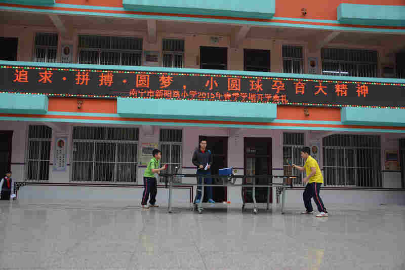 南宁市新阳路小学坚持传承创新,开创兵乓球校园文化特色。2015年3月2日该校举行了主题为“追求·拼搏·圆梦,小圆球孕育大精神”的开学典礼活动。城区教育局梁婷副局长和李飞燕主任亲自到新小指导了此次活动并检查开学相关工作。全校师生在朝阳下开始了本学期第一次升旗仪式,嘹亮的歌声响彻校园,向国旗诉说着爱国之心。接着由黄小芮同学给大家讲述乒乓球小故事,老师与同学还进行了兵乓球知识竞赛与技艺展示,充分展示了该校兵乓球文化的魅力与风采。在欢声笑语中,孟琳校长向全校师生致辞,表达了对全体师生的新年祝福。她鼓励孩子们积极参加本学期学校组织开展各类乒乓球趣味活动,希望同学们在新小的传统球类乒乓球运动中感受奋勇拼搏、努力争先的乒乓精神, 在竞技中磨炼坚强的意志、培养顽强的品质,为自己精彩的人生打下坚实的基础。开学典礼在全校师生《超越梦想》高亢的歌声中结束。充满特色的开学典礼激励了全校师生振奋精神、锐意进取,以良好的精神风貌投入到新学期的工作和学习中,为新学期创造了一个良好的开端。千里之行,始于足下,相信在孟琳校长的带领下,新小全体师生将从乒乓球这个小球中,彰显大精神,书写大世界。
