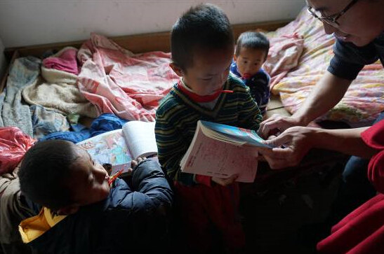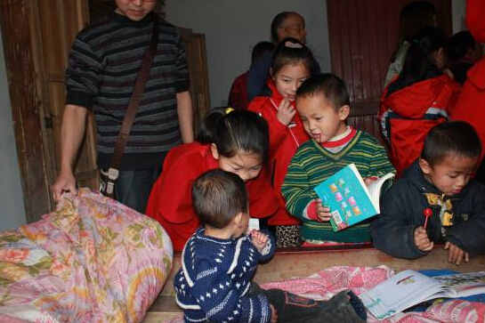 少先队员与孩子们交流(左