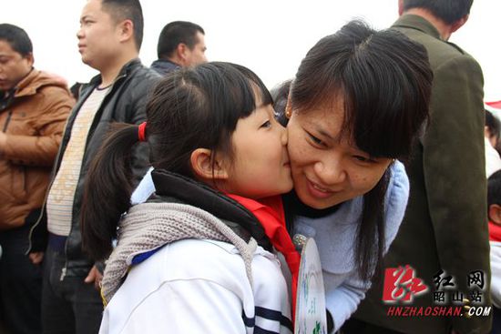 和平小学一年级六班的谭芸萱开心的亲吻妈妈。