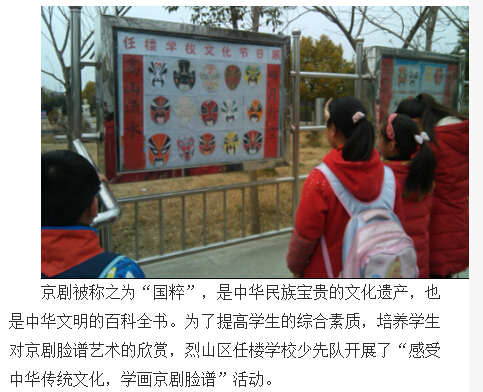 烈山区任楼学校少先队开展了"感受中华传统文化,学画京剧脸谱"活动。活动中,同学们了解了京剧的起源,欣赏了京剧名家的表演,观赏了各种不同的京剧脸谱,用彩色画笔把脸谱分别画在纸上,并在校园中展出。