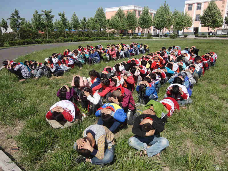 演练开始后,各班学生在任课教师的指挥下,迅速抱头蹲在桌下,关掉教室电源。疏散信号响起后,学生采取抱头姿势按疏散路线撤离到“安全地带”,用时不到3分钟。
