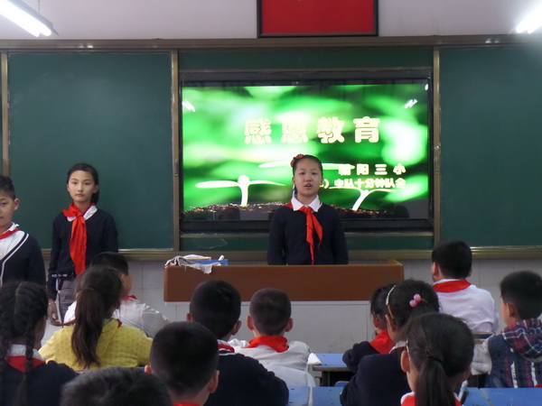近日,朝阳三小大队部发起了召开十分钟感恩队会活动,队会上,班主任老师们通过父母对孩子的付出与关爱来教育孩子们要对父母怀有感恩之心,通过感恩小测试来了解孩子们对身边的人关爱有多少。十分钟队会上,同学们在老师的组织下,积极上台发言,并表示今后一定要把学会感恩作为自己的做人准则,要把懂得感恩化作实际行动,在家中为父母做点力所能及的事,在学校做到尊师爱友。