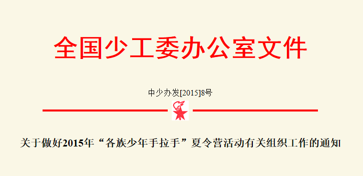 为抓住纪念中国人民抗日战争胜利70周年暨世界反法西斯战争胜利70周年的重大契机,深入开展爱国主义教育、国防教育和民族团结教育,把爱我中华的种子埋在各民族孩子的心灵深处,全国少工委拟在今年暑期继续举办“各族少年手拉手”夏令营活动。有关事项通知如下。