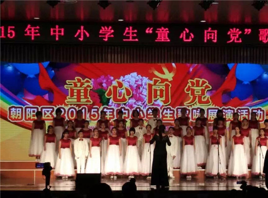 为深入贯彻落实党的十八大精神,引导未成年人培育和践行社会主义核心价值观,庆祝中国人民抗日战争暨世界反法西斯战争胜利70周年,2015年7月6日下午2:00,由朝阳区精神文明办公室、朝阳区教委主办,朝阳区学生活动管理中心、青少年活动中心承办的朝阳区2015年“童心向党”中小学生歌咏展演活动在清华附小商务中心区实验小学举行。