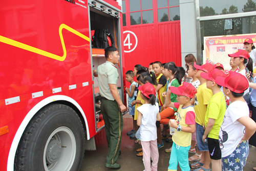 在高新区消防大队,孩子们观看了消防战士灭火演练,并被官兵们娴熟地操作、精彩的表演深深折服。随后,孩子们在官兵的帮助下试穿了消防服,试背了各种消防器材,近距离接触了解救火装备,在体验中提高了自护技能。孩子们还观摩了警营内务卫生军事化管理,现场感受了警营严整的军容、过硬的作风和严格的纪律。