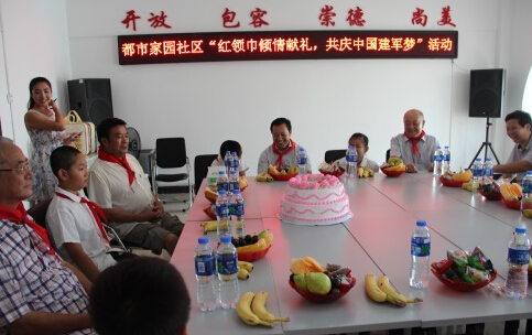 秦皇岛市海港区都市家园社区举办“红领巾倾情献礼,共庆中国建军梦”活动,带动辖区小虎子为5名退伍老兵亲手佩戴红领巾,听老兵讲军中故事,共同分享建军节蛋糕。