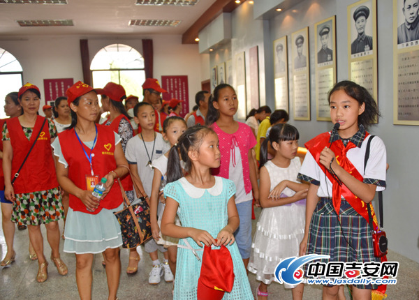 8月8日,遂川县明德小学红领巾小小讲解员在县革命烈士纪念馆为前来参观的游客讲解革命历史和先烈故事。遂川县明德小学挑选品学兼优的少先队员,经过培训学习,组建了一支红领巾小小讲解员队伍,今年暑假已为三批游客进行义务讲解。 肖远泮摄