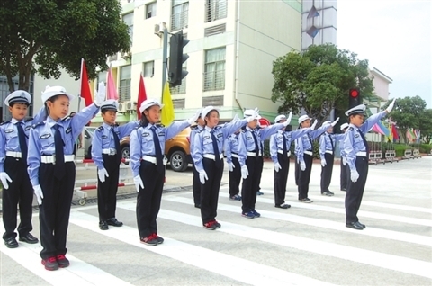 在昨天的成立仪式上,吴中交警城区中队负责人向小交警队进行了授旗,小交警队队长进行了发言,20名小交警队成员表演了敬礼、指挥手势等交通指挥技能。交警介绍,小交警队主要承担维护校园内部交通安全,协助做好高峰交通秩序,吴中交警大队还在校园内建立模拟路口、红绿灯装备等,定期开展校园交通安全教育活动。