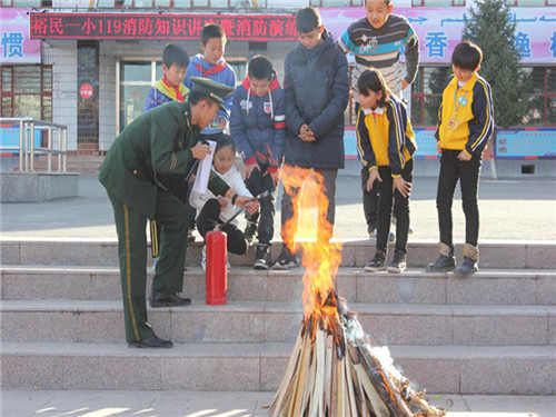 消防支队警官在给孩子们讲解灭火器使用方法