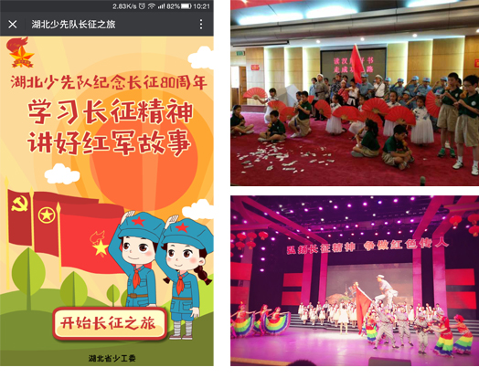 湖北省少工委开展了“学习长征精神,讲好红军故事” 和 “红色寻访”主题教育实践活动;武汉市举办了“弘扬长征精神,坚定理想信念”主题读书活动;荆州市开展了“荆州80万师生齐诵经典纪念红军长征胜利80周年”活动;宜昌市各中小学举行了纪念红军长征胜利80周年文艺汇演;十堰市郧阳区柳陂镇中心小学组织学生“描摹长征勇士,讲述长征精神”的活动;鄂州市第三中学在贺龙军部旧址纪念馆举办“铭记革命先烈,弘扬长征精神”主题教育活动;咸宁赤壁市第二实验小学举办红歌比赛;潜江市实验小学举办长征胜利80周年主题报告会。