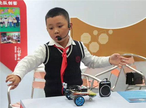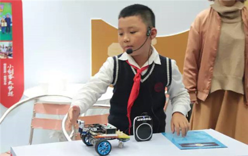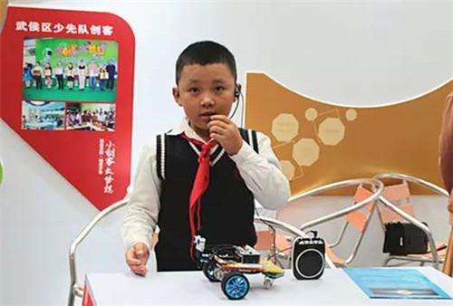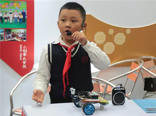 来自成华区小学的小创客尤疆越,正在讲述他的“超声波避障小车”!因为心疼妈妈,他自己写程序,做机器人,想让机器人帮妈妈做家务!他有一个梦想,想做一个发明家!