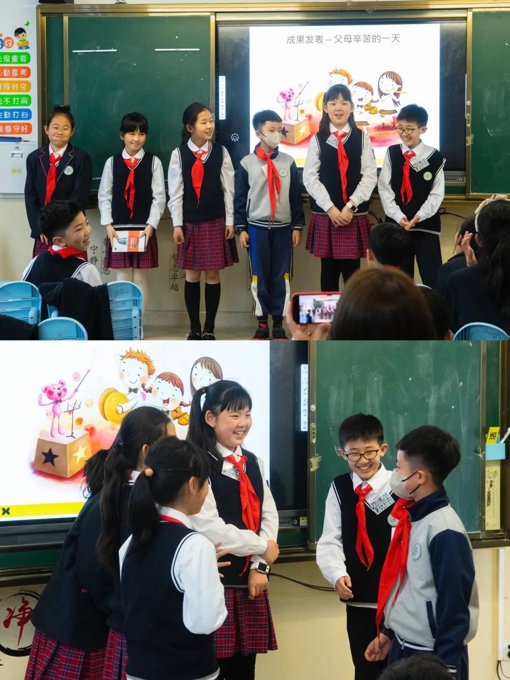 “我们为什么要感恩父母?”队员们用一场感人至深的小短剧——《父母辛苦的一天》给了我们清晰的答案。队员说:“我们上学感到辛苦,可不知道的是爸爸妈妈要更早起床照顾我们的衣食出行,送完我上学还要去上班,打拼事业。”为人父母的用心良苦本不是理所应当,队员们也通过角色转换更能体谅父母的辛苦与不易,学会感恩是每位孩子人生的必修课。