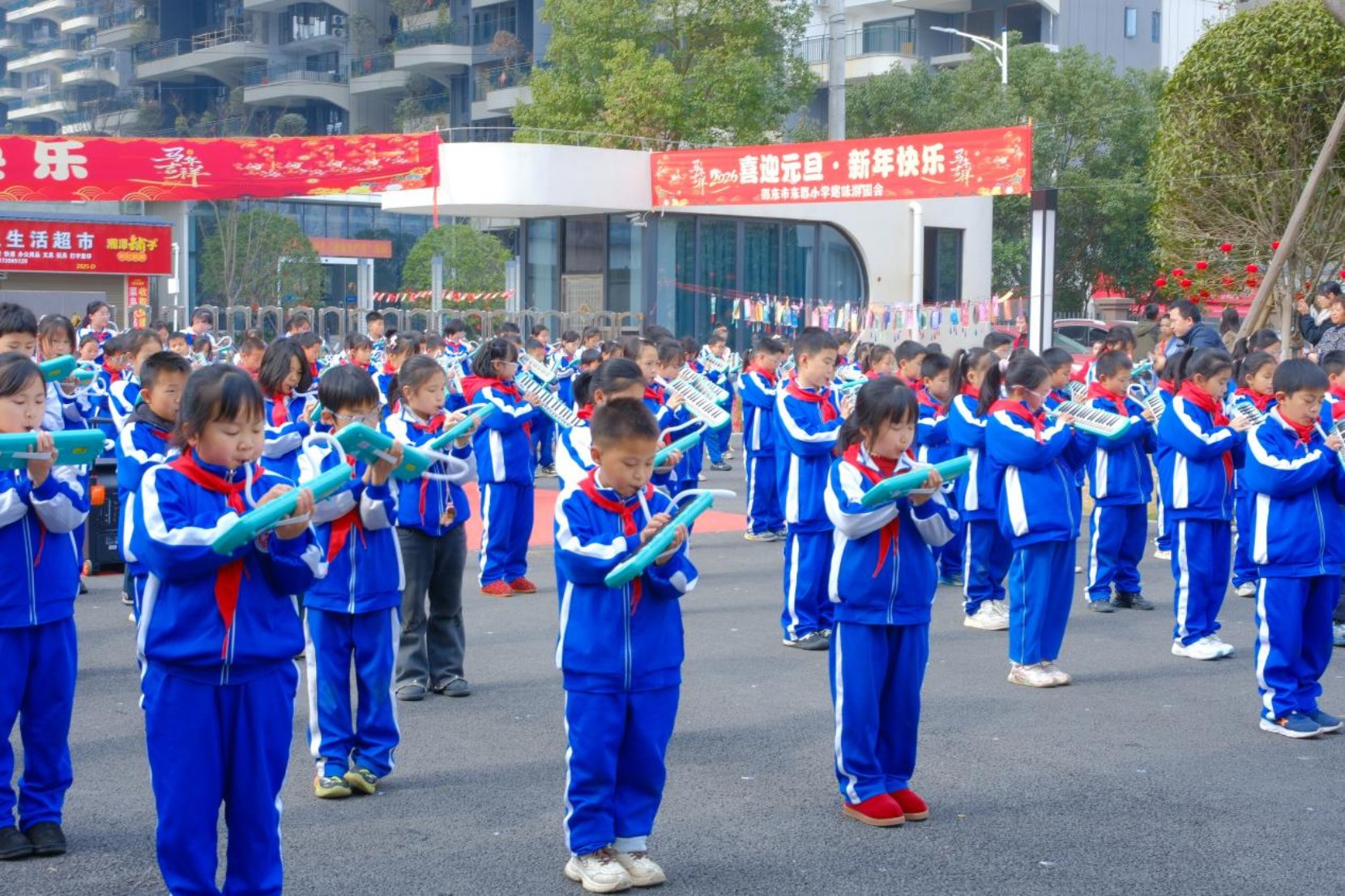 活动于12月30日下午正式启幕,三、四年级少先队员组成的演奏队奏响《新年好》《欢乐颂》等经典曲目,悠扬的口风琴旋律搭配校园里悬挂的红灯笼,瞬间营造出浓厚的节日氛围。本次活动同步开启直播,活力才艺区的精彩展演通过屏幕传递到每一间教室,未能到场的学生齐聚班级,共享这场视听盛宴。