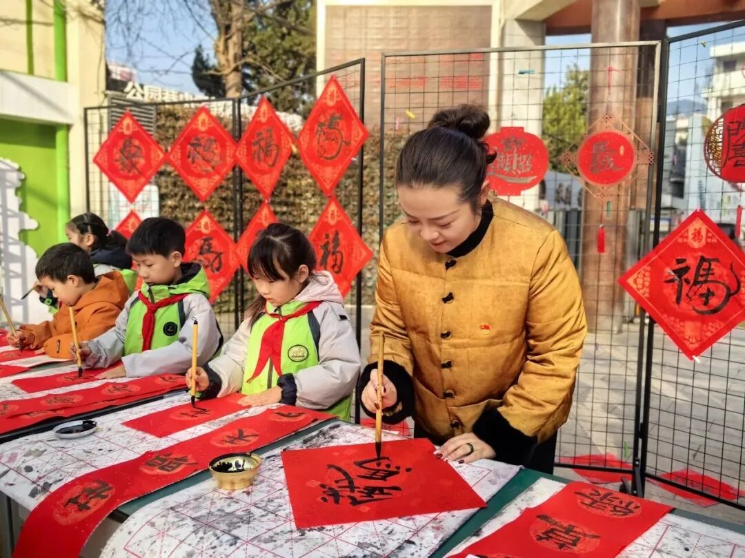 “春回大地千山秀,福降人间万户欢”“东风解冻辞旧岁,笔墨含香迎新春”,一句句寓意吉祥的春联佳句,在队员们稚嫩却有力的笔触下跃然纸上,墨香与红纸的喜庆相互交融,氤氲出满满的年味。