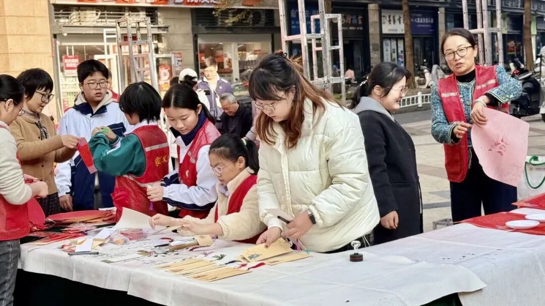 “挥墨写春”区域墨香萦绕、暖意融融,队员们或凝神临摹经典吉语,或随心创作新春寄语,沉浸在一笔一画的笔墨世界中。红纸黑字间流淌的,不仅是辞旧迎新的欢庆气息,更是中华优秀传统文化的温度与代际传承的力量,让写春联这一传统习俗在笔墨浸润中焕发新生,在亲子、邻里间鲜活延续。