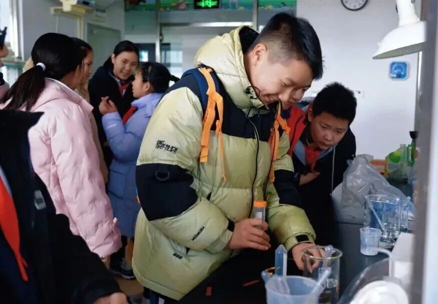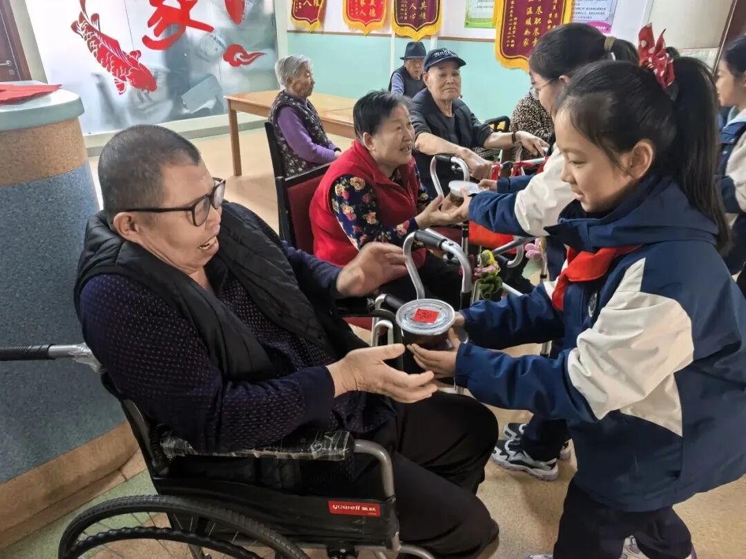 红领巾送暖队带着亲手熬制的姜茶和福字,走上街头为公交车司机、环卫工人、快递员送上祝福,他们还走进敬老院陪长辈闲话家常,用小小善举为城市坚守者送去冬日温暖,让爱心在传递中升温。