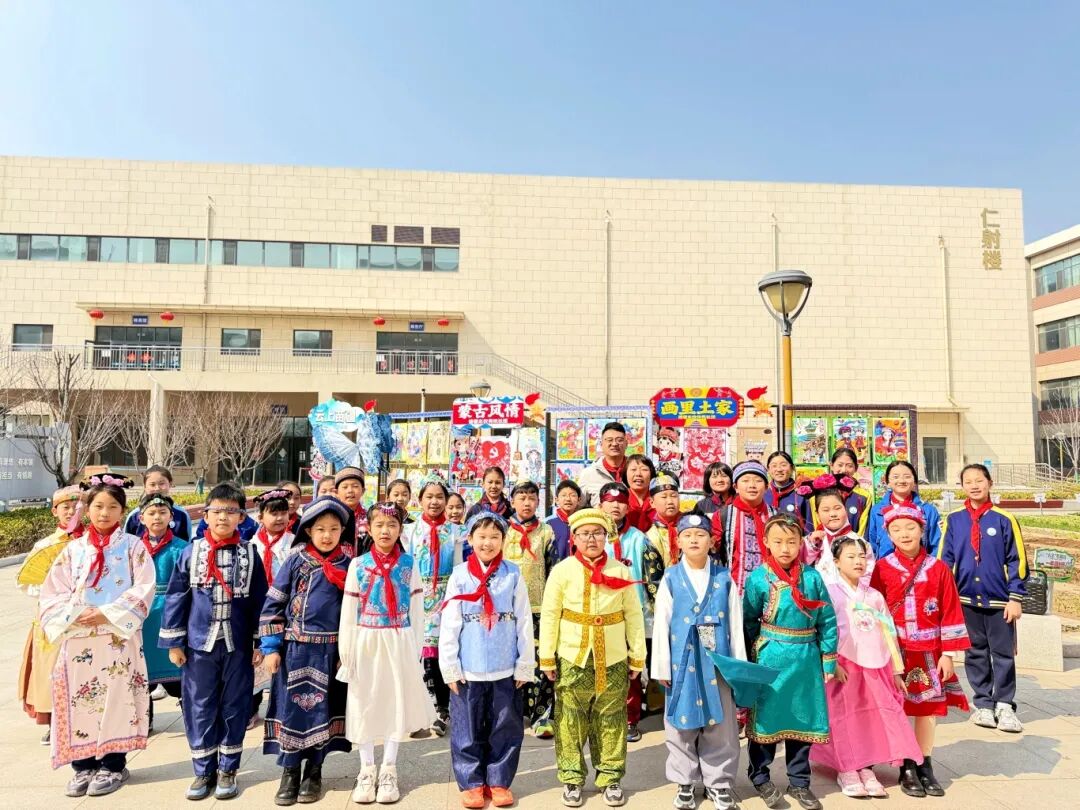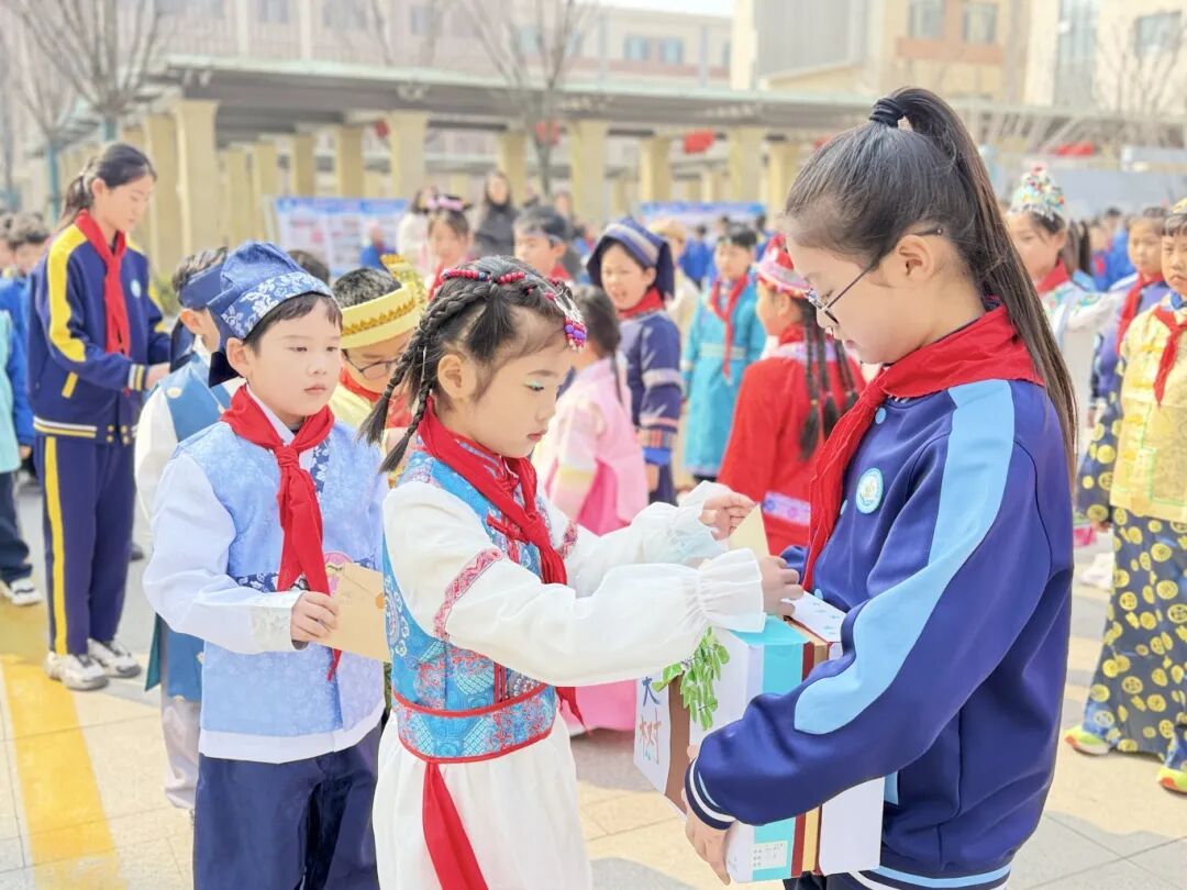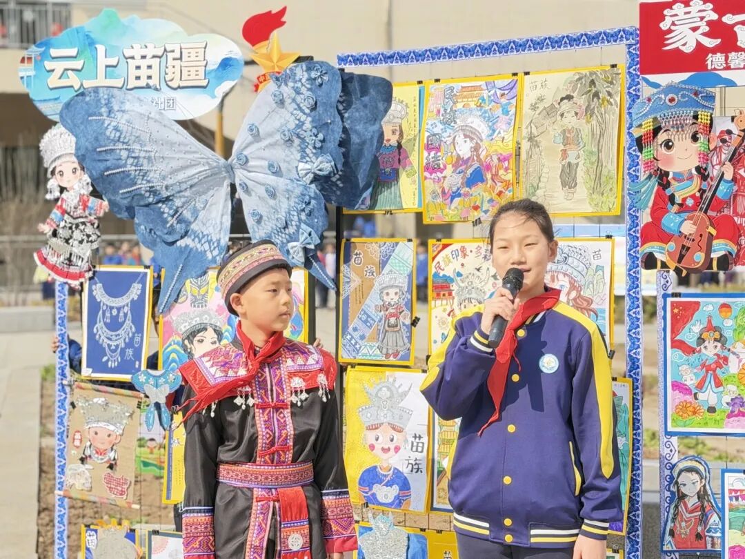 听!悠扬的《吉量》歌声响起,各民族小队员们穿着特色民族服装,载歌载舞,欢快入场!蒙古袍、苗家银饰、土家西兰卡普……一抹抹绚丽的色彩,一张张灿烂的笑脸,队员们在民族展架前自信亮相,手拉手、肩并肩,像一颗颗饱满的石榴籽紧紧相拥,把“中华民族一家亲”的美好画面定格在春日校园里!校园里的各民族小伙伴,日常里互帮互助、相亲相爱,让民族团结的种子在心底早早发芽,而民族团结,正是我们守护和平生活的坚实根基。