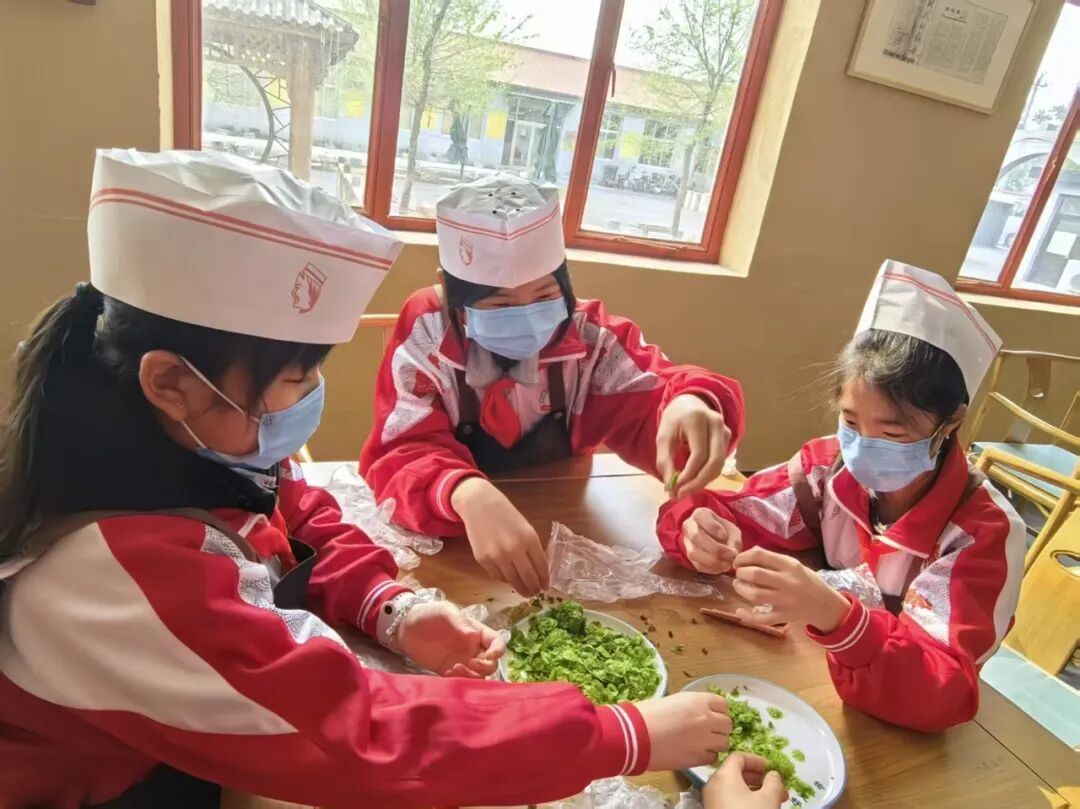 在榆钱美食制作劳动体验中,队员们亲手择榆钱、制作榆钱饭、榆钱糕、榆皮饸饹面等传统乡土美食。通过动手实践,大家不仅掌握了实用的生活技能,更在亲身劳作中感悟家乡饮食文化的独特智慧与深厚情感。