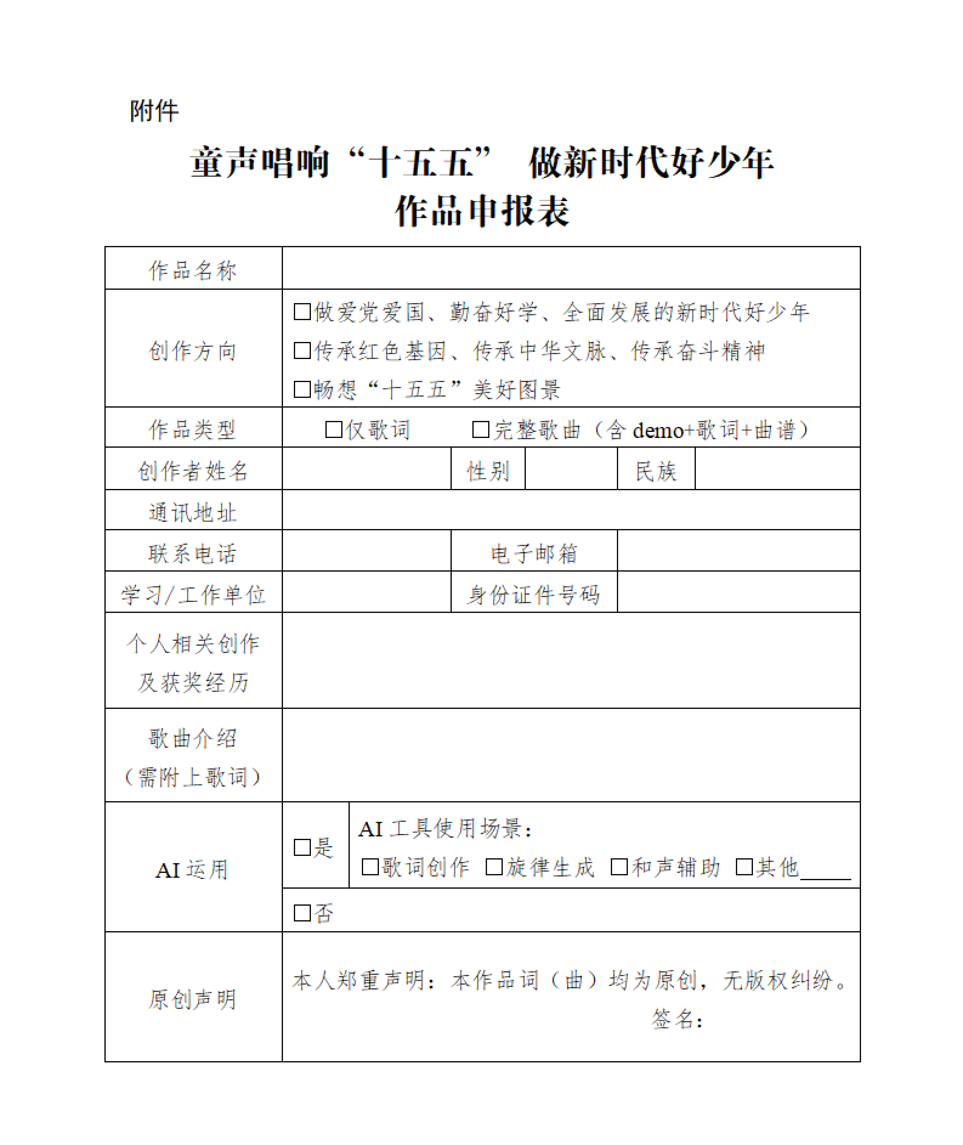 5.AI运用。作品如使用AI工具辅助或用AI辅助创作的,需在申报材料中明确标注,并简要说明AI工具的使用场景(如歌词创作、旋律生成、和声辅助等)。