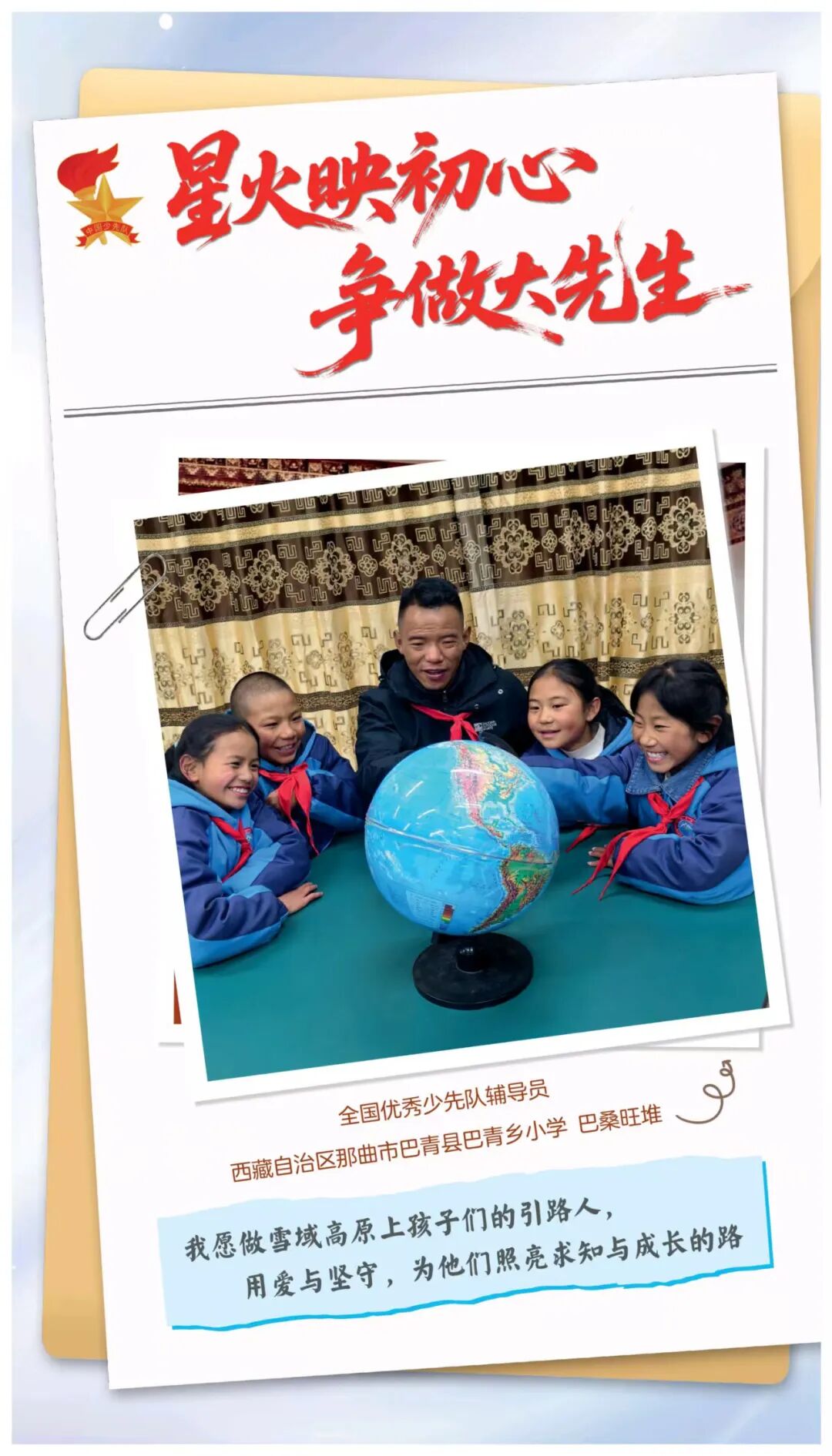 风裹着沙砾掠过巴青乡小学的操场时,我总能看见孩子们胸前的红领巾在4100米的高海拔上飘成一团团火焰。我叫巴桑旺堆,是这所高原小学的少先队辅导员。稀薄的空气让每一次呼吸都带着重量,可每当孩子们喊我“巴桑老师”,并用那双清澈如纳木错湖水的眼睛望向我时,所有的艰辛都化作了掌心的暖意——我愿做雪域高原上孩子们的引路人,用爱与坚守,为他们照亮求知与成长的路。