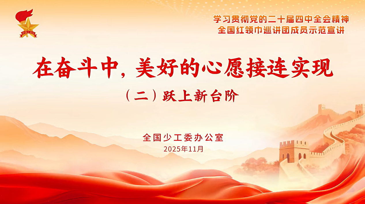 为深入学习宣传贯彻党的二十届四中全会精神,近期,全国少工委办公室组织全国红领巾巡讲团骨干进行了集体备课,并先后前往多地开展宣讲,用“童言童语”讲好党的创新理论。为赋能基层,现推出全会精神示范宣讲稿(少先队员版)及课件,方便少先队辅导员、少先队工作者组织队课、宣讲等活动使用。